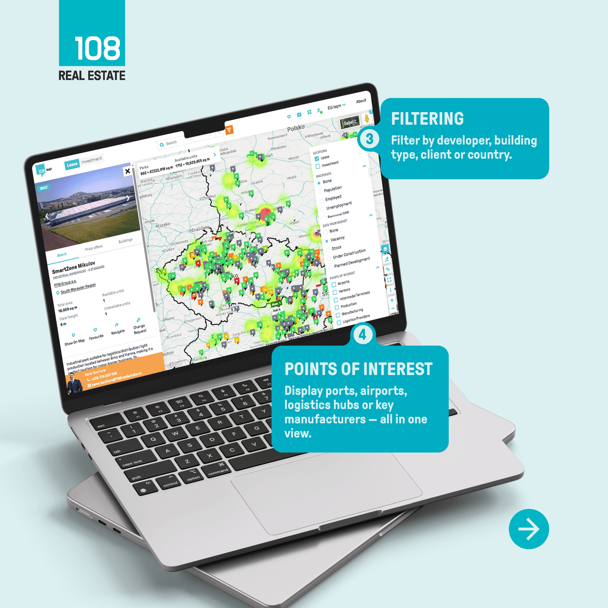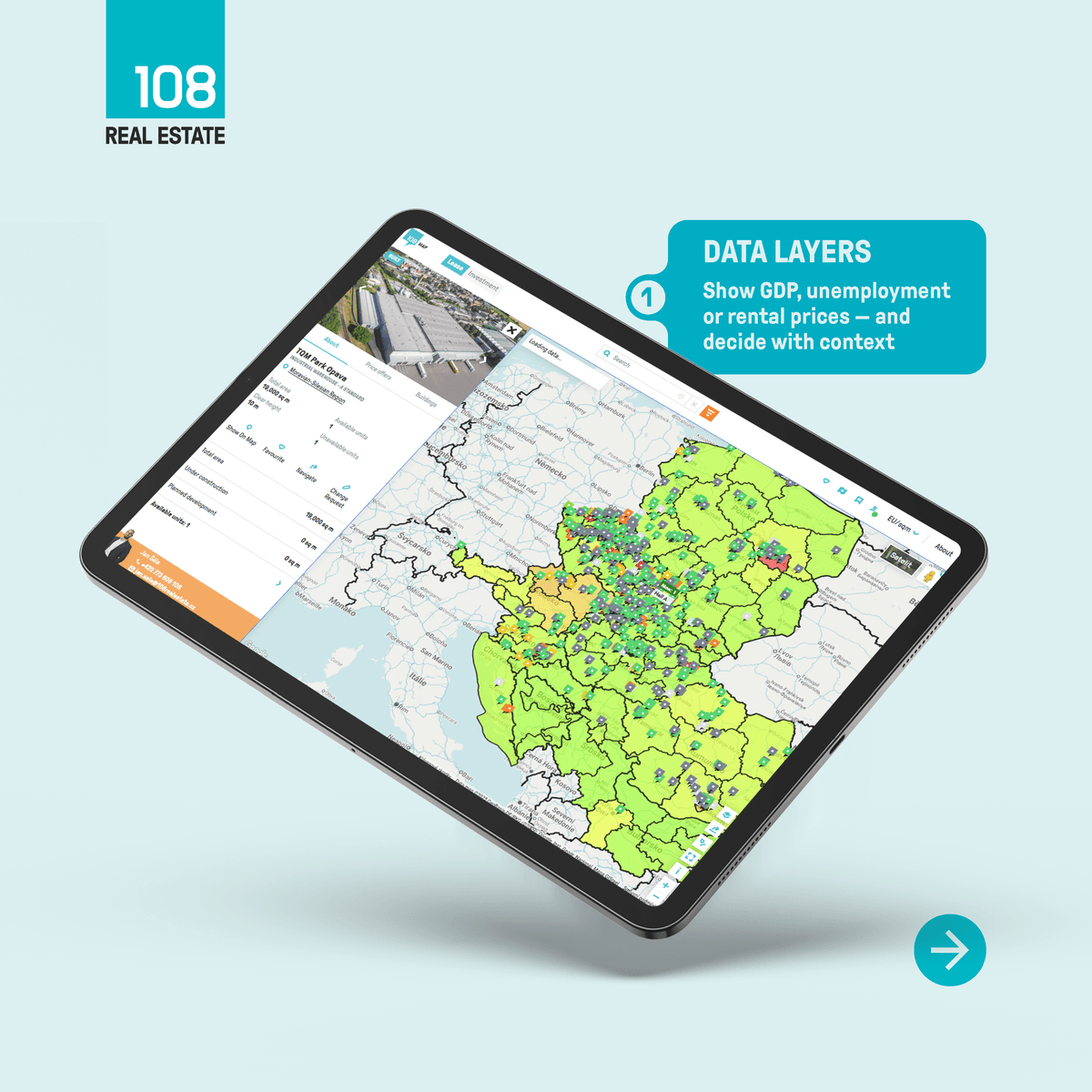 Nisu sve karte iste. Dok neke prikazuju samo točke na stranici, naša potpuno nova 108Map pruža kontekst, detalje i logiku nekretnina. Daje vam sveobuhvatan pregled tržišta industrijskih nekretnina i pomaže vam pronaći pravo rješenje za vaše poslovanje – bilo da tražite industrijski prostor za najam, skladišnu jedinicu ili logističku halu.